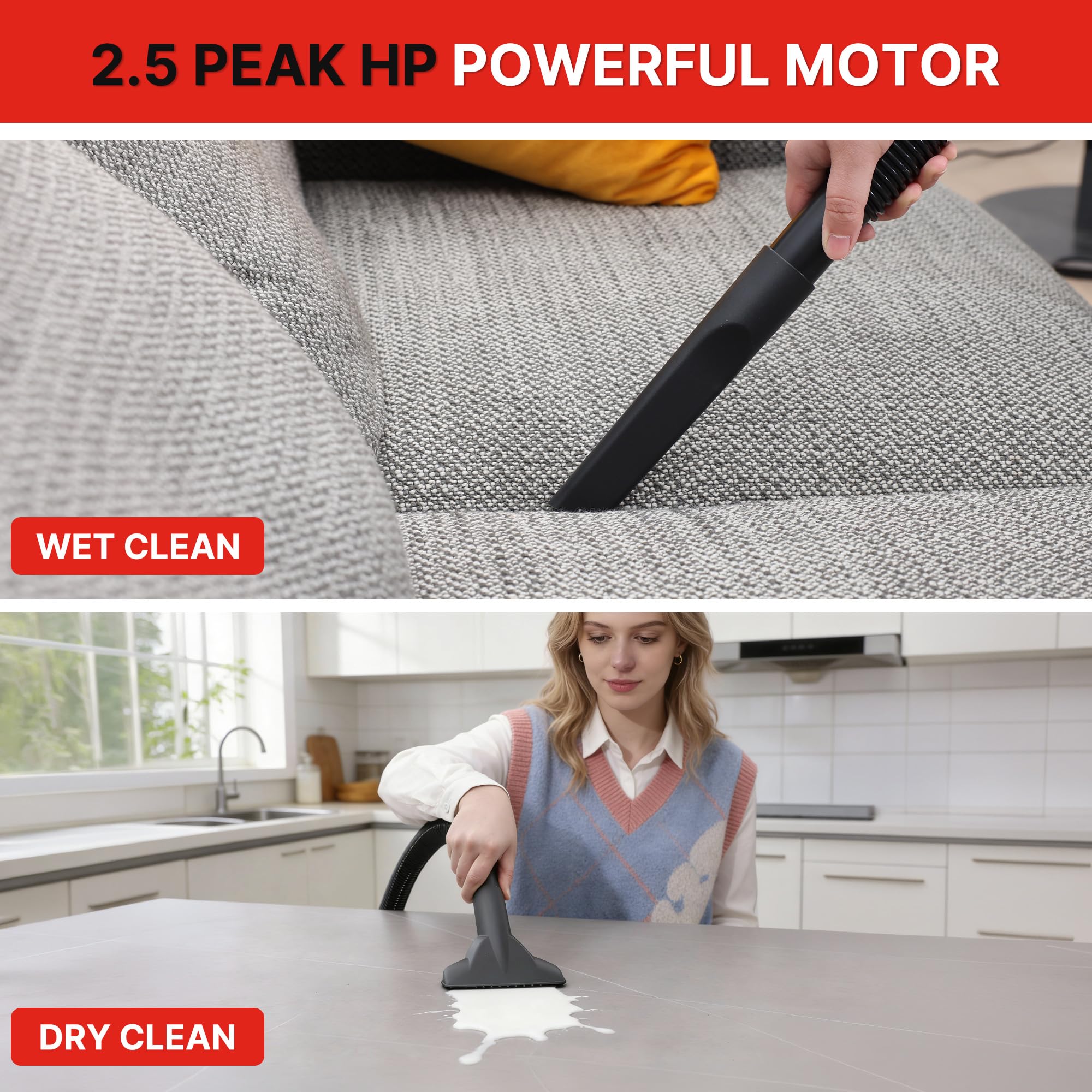 - 3-In-1 Cleaning:Powered by an 850W, 2.5 Peak HP motor, this wet/dry vac provides strong wet & dry vacuuming, along with a convenient blower function. Easily tackles dust, sawdust, spills, and everyday messes.