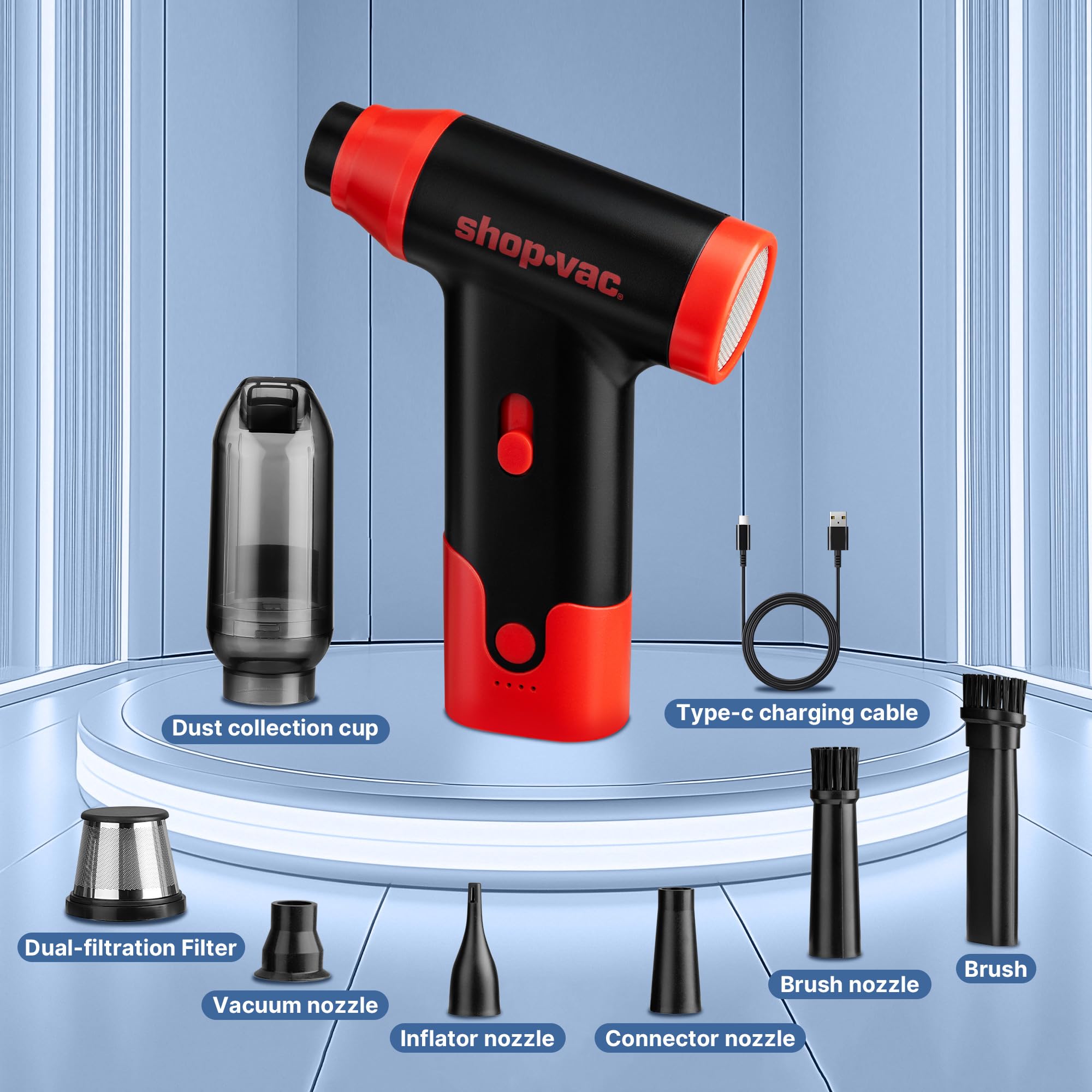 Shop-Vac 2-in-1 Electric Air Duster & Vacuum, 110000 RPM Cordless Air Blower with Brushless Motor, Variable Speed and Rechargeable, 6 Nozzles for Computer, Keyboard, House, Outdoor and Car