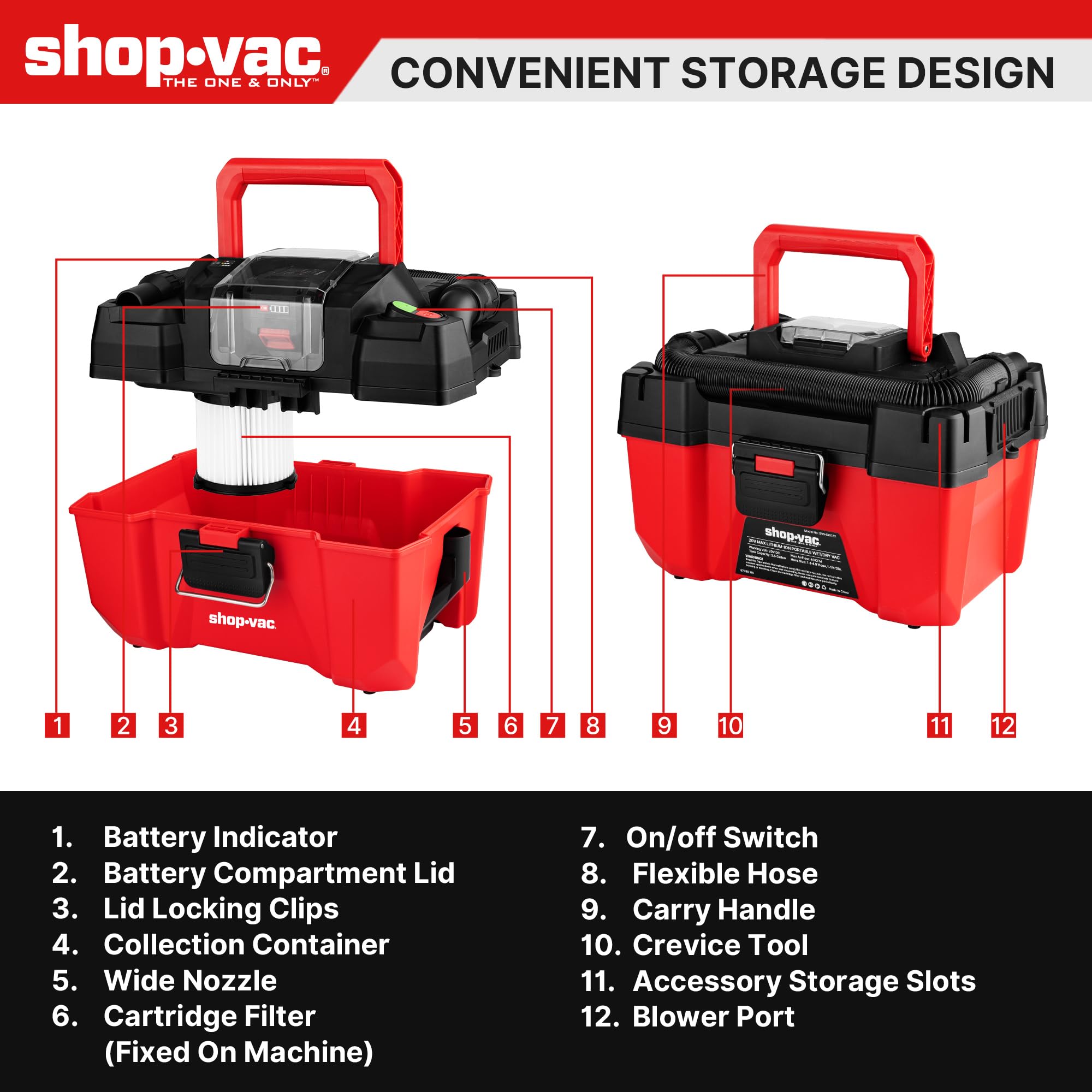 Shop-Vac 20V Cordless Wet/Dry Vacuum, 2.5-Gallon Tank, 5ft Hose, 4.0A Battery and Charger Included