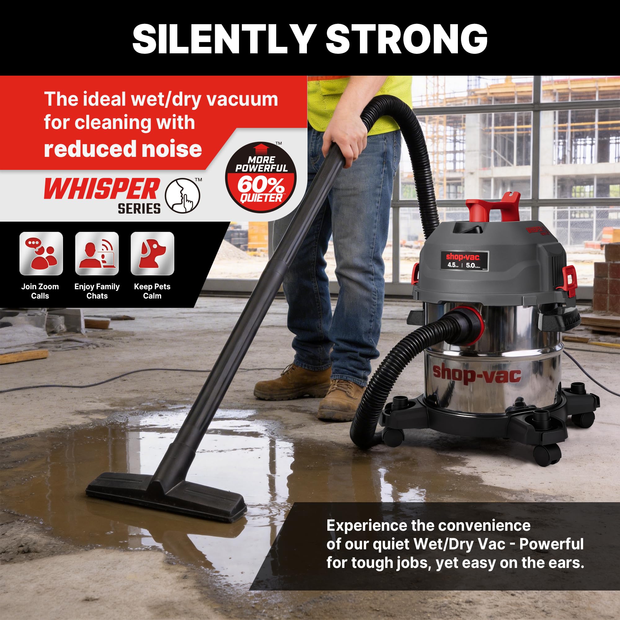 Shop-Vac 5 Gallon Ultra Quiet Shop Vacuum Wet and Dry, 4.5HP Stainless Steel Tank Wet/Dry Vacuum with Attachments, 1-7/8 In. x 7 Ft Hose, 15 Ft Cord, Ideal for Jobsite, Garage, Workshop & Home 5430542
