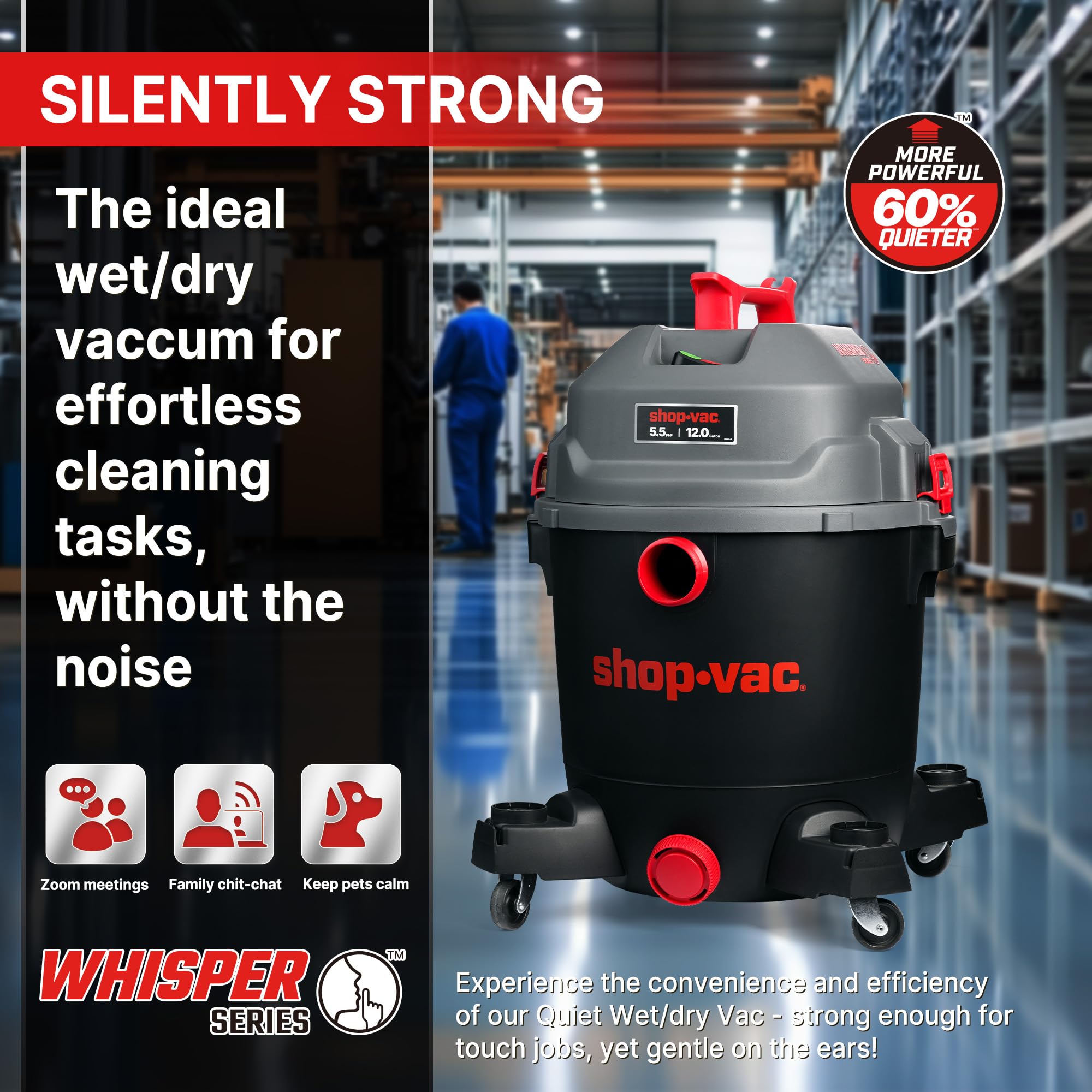 Shop-Vac 5430098 Ultra Quiet Wet/Dry Vacuum, 12 Gallon, 5.5 HP Powerful Suction & Heavy Duty for Jobsite, Garage, Workshop & Home
